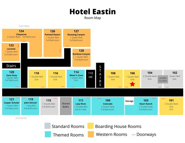 Seven of The Hotel Eastin's rooms are themed. In addition to the clean, comfortable beds and linens featured throughout the Hotel, the rooms are decorated to reflect a piece of Colorado's and Grand County's rich Western history.The Zane Grey room is dedicated to renowned 19th century author Zane Grey, who penned his novel "The Mysterious Rider" while staying in the Hotel's northern-most room that looks out on the Kremmling Cliffs. The Zane Grey room features: